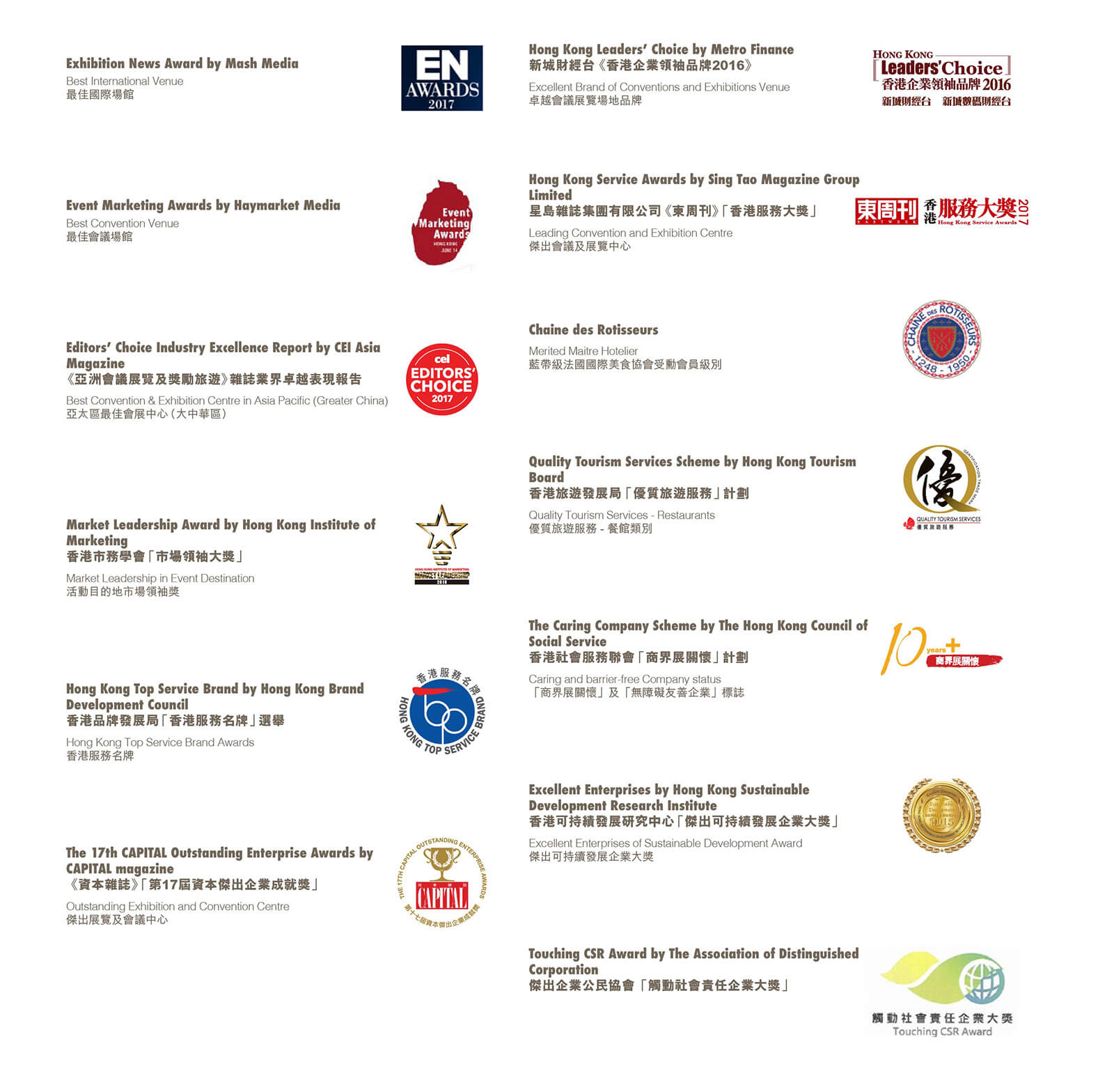 (香港,2017年6月28日) 亞洲國際博覽館最近榮膺被喻為全球博覽業界權威大獎、由Mash Media EN Award頒發的「最佳國際場館」大獎 (Best International Venue),創下香港紀錄。英國博覽業權威雜誌Exhibition News (EN) 由全球展覽業協會UFI (http://www.ufi.org/) 官方合作媒體Mash Media發行, EN Awards獎項由超過25名業界獨立團體組成遴選委員會,根據多個嚴格準則選出,包括世界各地的博覽場館如何協助國際展覽成功舉辦、場館設施及服務的提升、為主辦單位及參展商引進創新的客戶體驗、場館業務表現及增長等,並由主辦單位推薦。