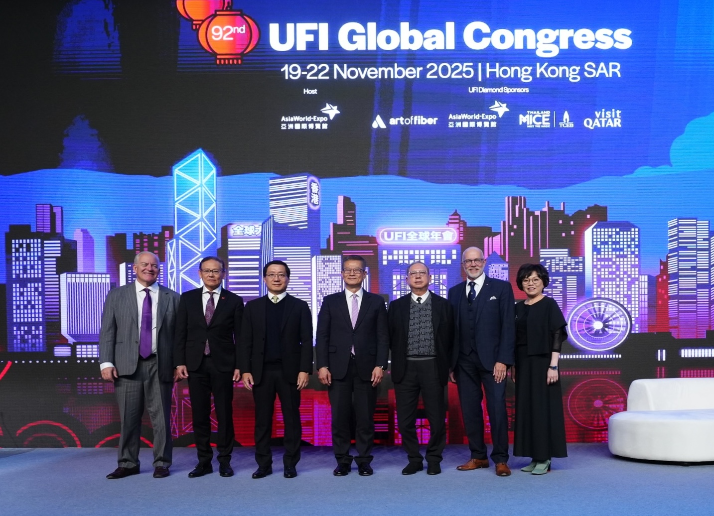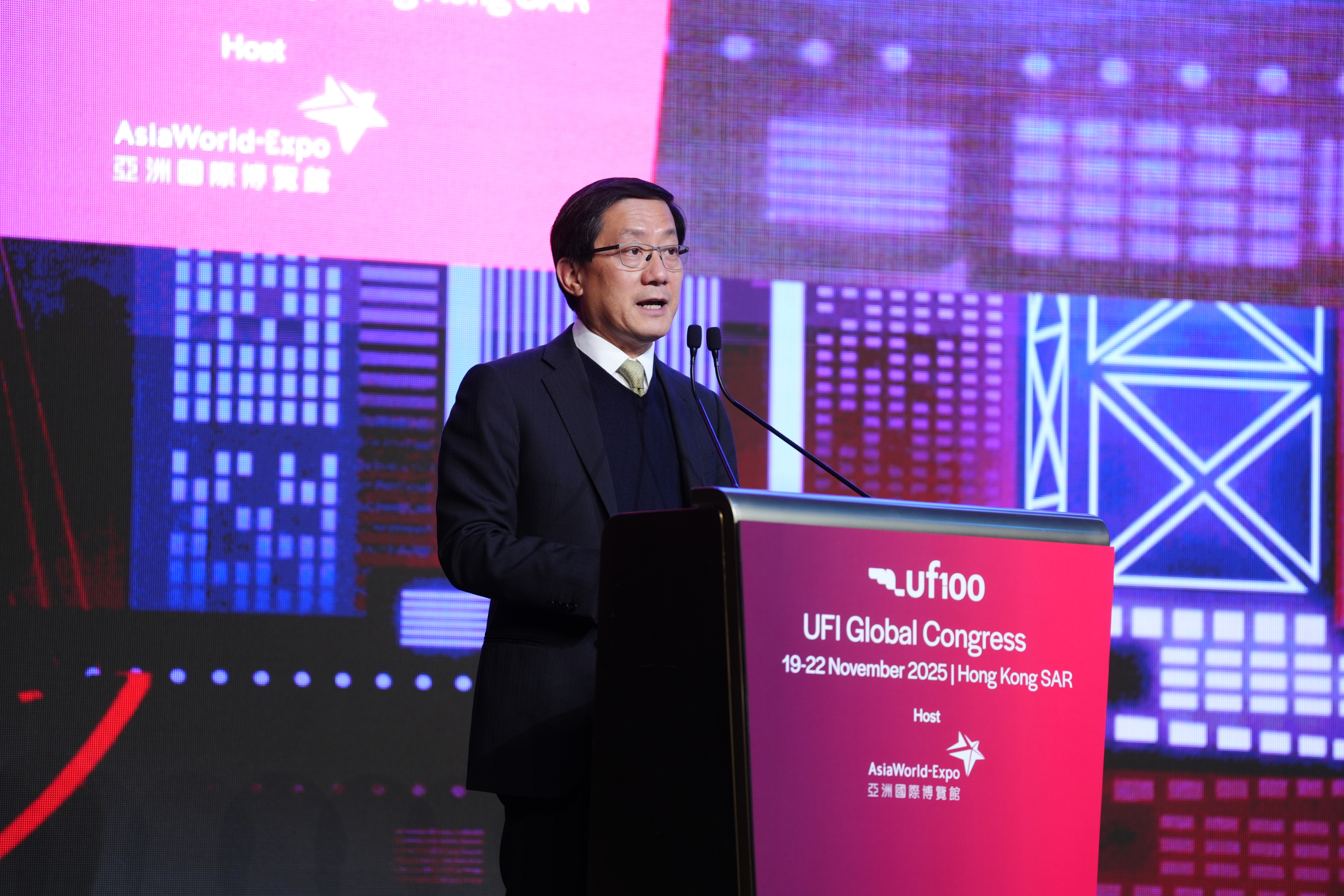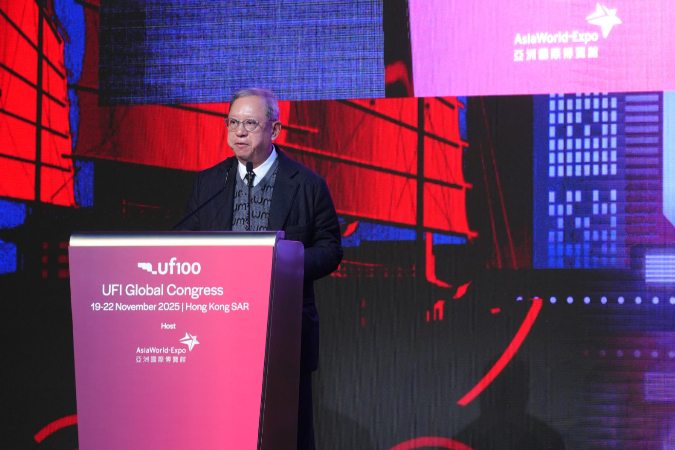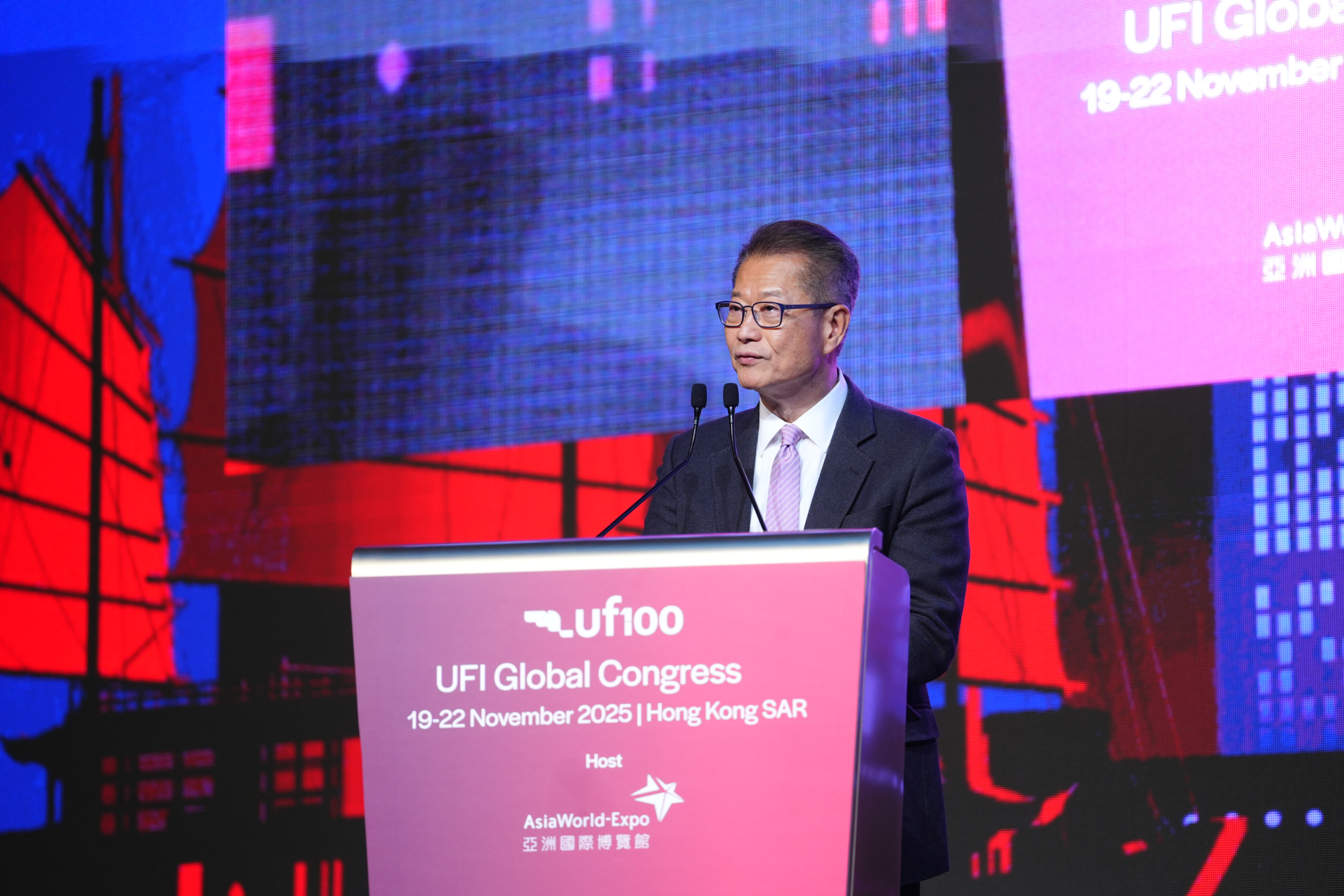 開幕典禮於11月20日隆重舉行,香港特別行政區財政司司長陳茂波先生擔任主禮嘉賓,香港機場管理局主席林天福先生、香港旅遊發展局主席林建岳博士,以及國際展覽業協會(UFI)主席Hugh Jones 先生於典禮上致辭。陳茂波在致辭時表示:「展覽的核心在於建立商業聯繫,並促進產品與服務的貿易。是次年會選擇在亞洲國際博覽館舉行,充分顯示國際業界對建立聯繫的重視。香港國際機場是通往中國內地、亞洲乃至全球各地的門戶,每日有超過1,100班航班往返全球200多個目的地。事實上,香港一直以來擔當着「超級聯繫人」的角色,在「一國兩制」下,有便捷乃至優先進入內地市場之利,同時亦保持作為國際貿易、商業及金融中心的獨特優勢。」 亞博館持續透過設施升級與活動內容多元化,進一步鞏固香港作為「亞洲盛事之都」的領先地位。正如林天福先生在致辭中指出:「無縫連接是亞博館一大優勢。亞博館不單毗鄰連接全球超過200個航點的香港國際機場,亦擁有座落港珠澳大橋橋頭堡位置的優勢,是各國企業進軍大灣區市場的理想平台。展望未來,亞博館正全力推進走在時代尖端的二期發展,包括容納二萬人的新場館及更多會議展覽設施,讓亞博館具備更優越條件吸引世界級表演節目以及大型展覽、會議活動落戶。亞博館二期將是機場城市計劃SKYTOPIA重點項目之一,我們有信心SKYTOPIA將鞏固香港作為地區會展樞紐及盛事之都的地位。」 本屆UFI全球年會不僅讓業界親身感受香港的策略性地理優勢,更為全球展覽領袖提供重新認識香港的契機。旅發局主席林建岳博士表示:「闊別25載的UFI全球年會今年重返香港舉行,更欣逢UFI成立百年慶典,我們感到非常興奮,盛會正好彰顯香港作為『國際會展之都』的地位,意義非凡。香港坐擁友善的營商政策、世界級的基建、高水平的專業服務,以及聯通大灣區的獨特機遇,勢將持續吸引更多亞太區內的大型國際商業活動來港舉行。香港除了是商業樞紐,更憑藉全年不絕的世界級盛事、精彩活動、特色節慶和景點,以及令人難忘的旅遊體驗,展現香港的活力多姿。我誠邀與會的全球展覽業界領袖走出會議廳,深入探索香港的多元魅力。」